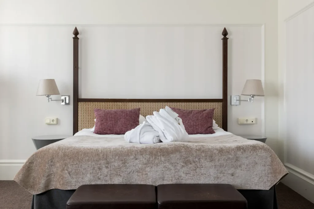 Deluxe Double is an elegant room with stylish decor, generous floor space, and natural light. Deluxe Double has more of what we like to call “sophisticated luxury” or good things in life. Allow work to take a break and slip into the bathrobe and slippers, lean back in the comfortable bed or a cozy armchair. There are also a writing desk and a spacious wardrobe available. The bathroom has either a shower or a bath and is equipped with both a dental and a shaving kit.