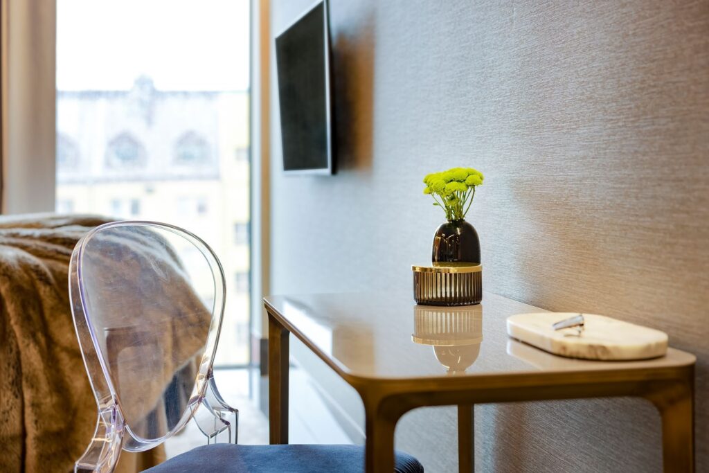 Our new Deluxe rooms (17m²) at Hotel Riverton in Gothenburg offer a modern and elegant international style with warm colors that create a welcoming atmosphere. The elegant wooden elements in the rooms create a calming feeling. The hotel rooms are tastefully decorated with glass doors in the bathrooms that contribute to a brighter and airier feeling in the room. They are located between floors 2–6 of the hotel and have a queen size bed.