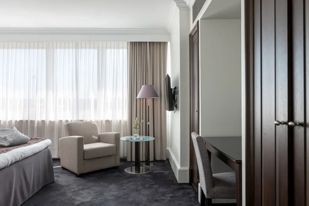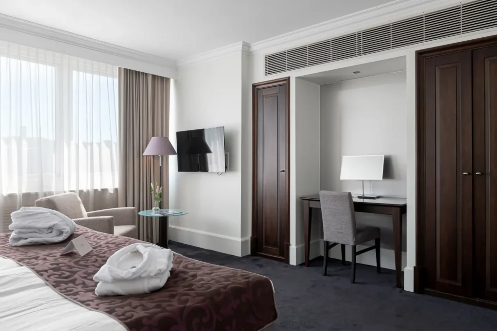- Amenities: Bathrobe and slippers, Coffee and Tea Maker, complimentary Wi-Fi, Desk, Flat-screen TV, Full-length Mirror, Hair Dryer, Iron and ironing board, , Safe deposit box